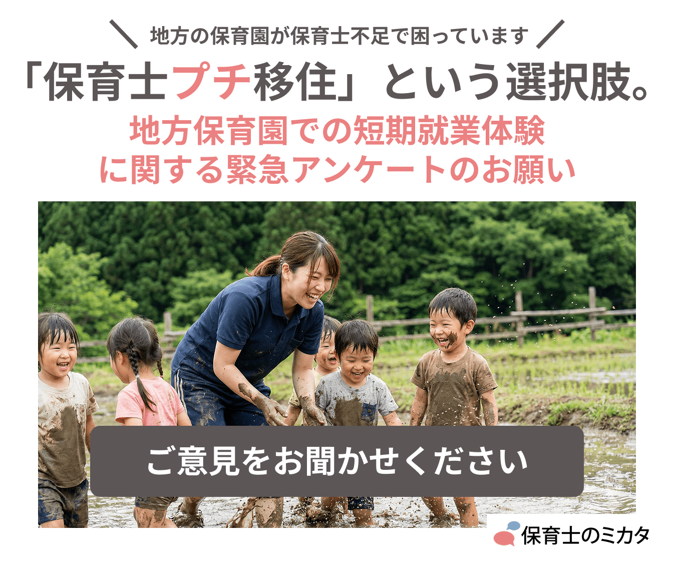 そこで、「保育士のミカタ」は都会で働く保育士の皆さんに、新しい選択肢として『プチ移住体験』をご提案したいと思っています。